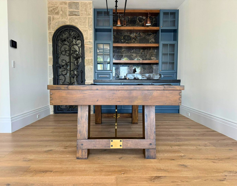 The Isaac pool table in stressed-out refectory brulee brown and gold by Plank & Hide is a chic design with crafty features. Brushed gold metal accents add a perfect rustic flair to modern game rooms, offices, and commercial bars. The oversized wood frame, legs, and rails have a finish of luxurious distressed black décor. Hand-pounded golden sites are visible across the top, and industrial wrought-iron elements add modern appeal. The brushed golden turnbuckles are one of the most sought-after looks in the high-end interior design world.